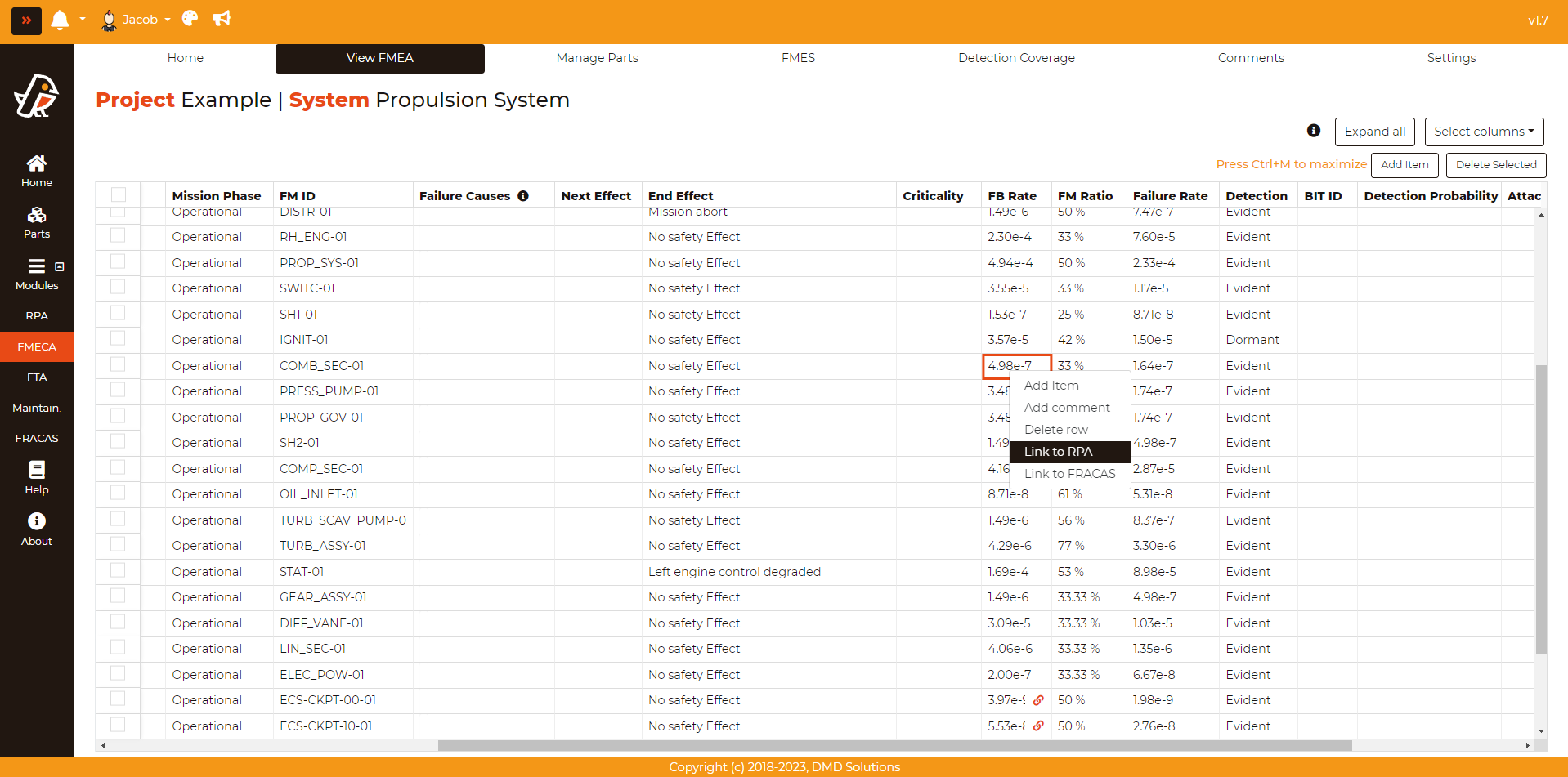 The user can work on the FMECA project in FMECA > View Table, the system can be selected in the FMECA module home page.