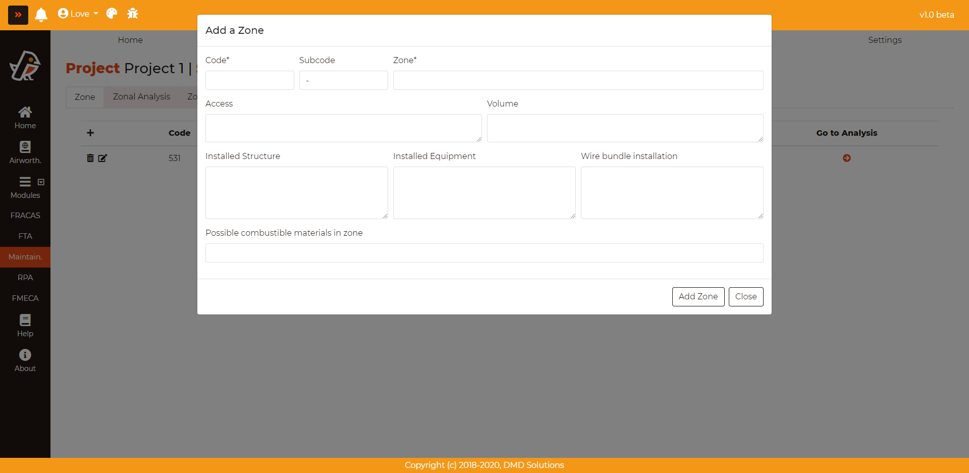 To enter a Zone, go to Maintainability > MSG-3 Zonal Analysis > Zone and click on the plus button + on the header of the table. The following form will be displayed: