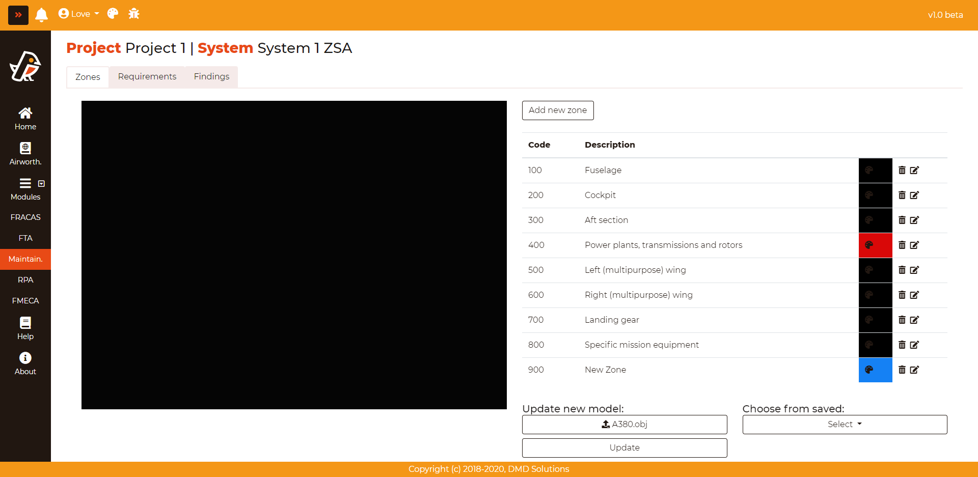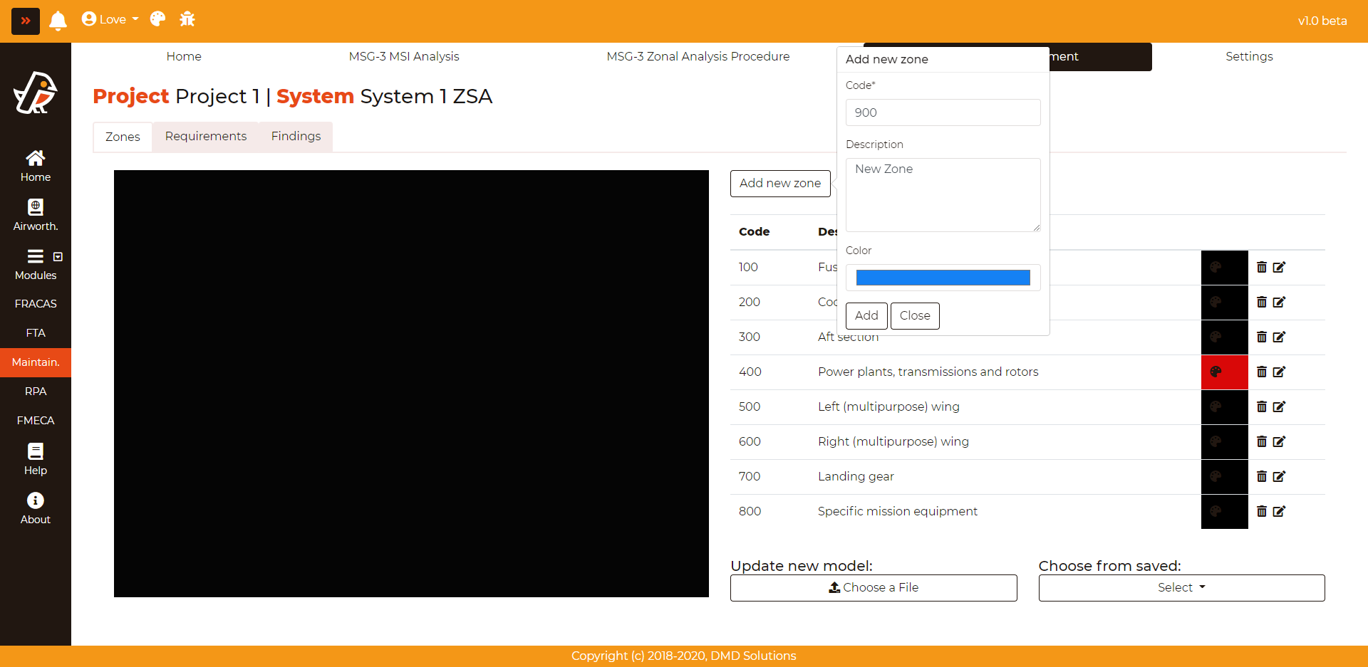 To enter a zone, go to Maintainability > Zonal Safety Assessment > Zones and click on the Add new zone button. A popover will appear: