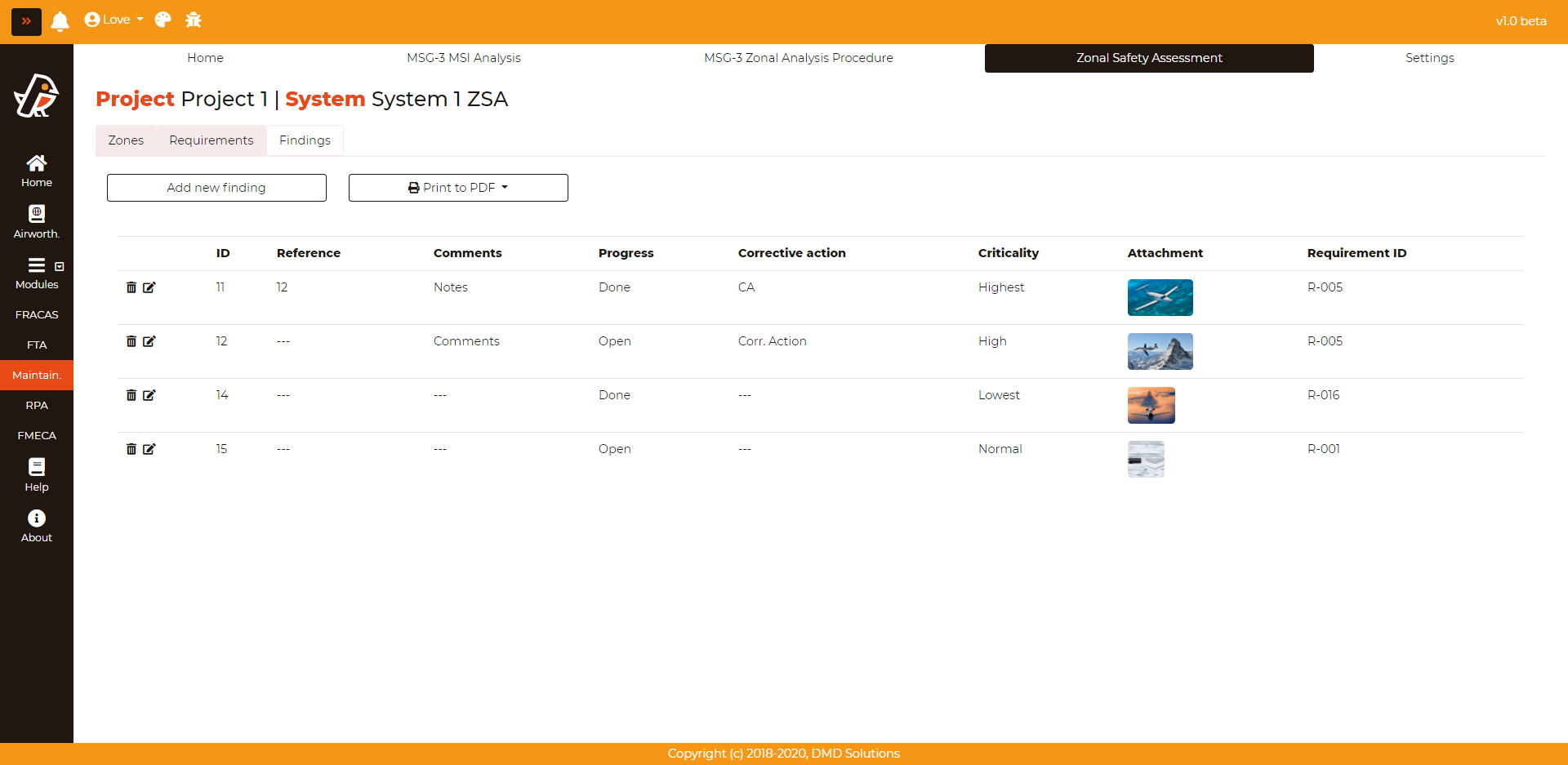 All the findings are listed in a table in Maintainability > > Zonal Safety Assessment > Findings.