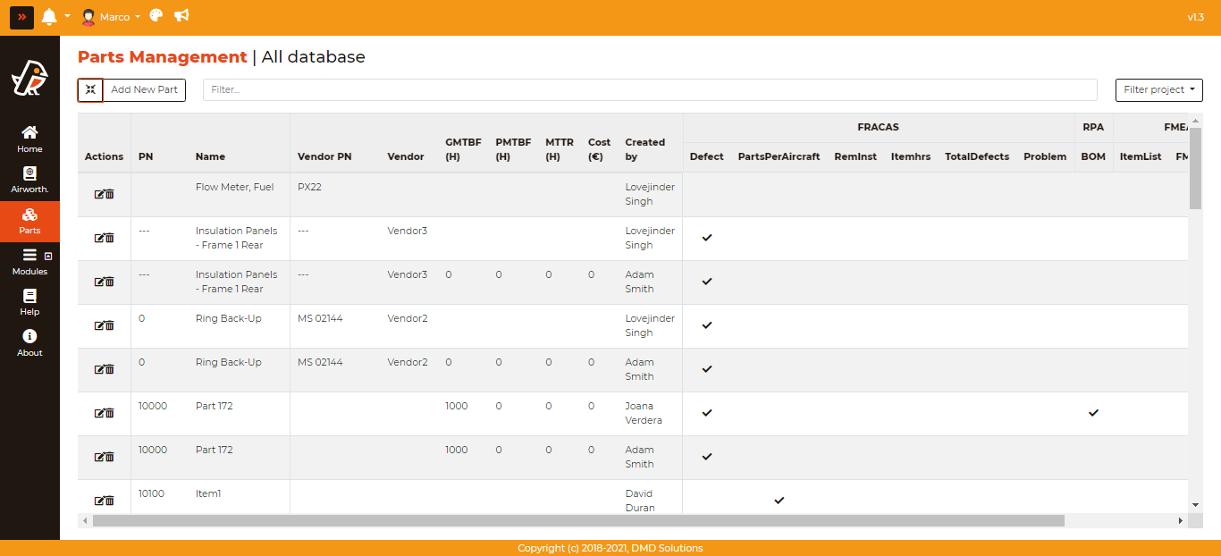 Expanding/Minimizing: Unlike the first image of this section, which has the table minimized, the image above is expanded. When expanded, one can view the parts’ GMTBF, PMTBF, MTTR, Cost and author. This is achieved by clicking on the expand button, which is located on the top left corner of the screen.