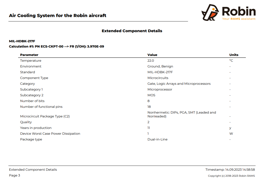 In this form, the user can select the sections to be printed. Also, the items can be sorted by failure rate (lower to higher or viceversa) or the order that they appear in Robin website interface. The last option allows the user to choose the level of details in the Component details section (explained below).